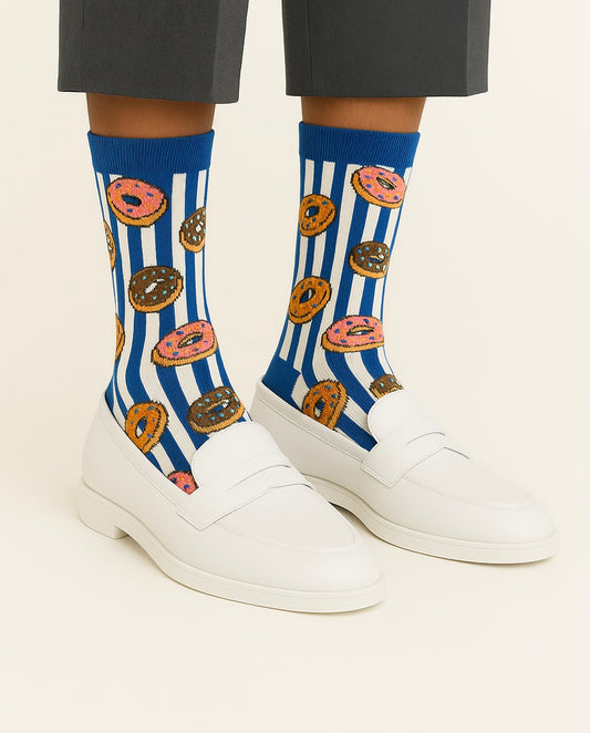 Chaussettes fun Sweet Donut Stripe – Donuts rayées bleues et blanches et originales